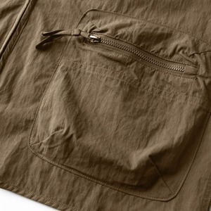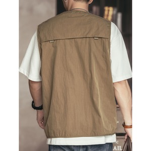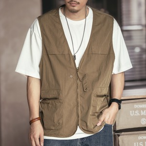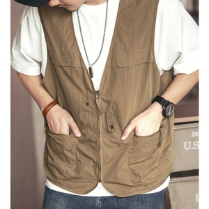 フロントジッパーとマルチポケットを備えたVネックのノースリーブベストは、着心地の良さと機能性を両立したアイテムです。シンプルなデザインながら、複数のポケットで収納力も抜群。普段使いからアウトドアまで、様々なシーンで活躍します。着こなしのアクセントにもピッタリです。
