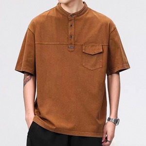 バンドカラーと便利なポケットが特徴の半袖シャツです。ゆったりとしたシルエットでリラックスした着心地を実現。カジュアルなスタイルにぴったりで、デイリーユースに活躍します。一枚で着ても、ジャケットやカーディガンを羽織っても様になります。
