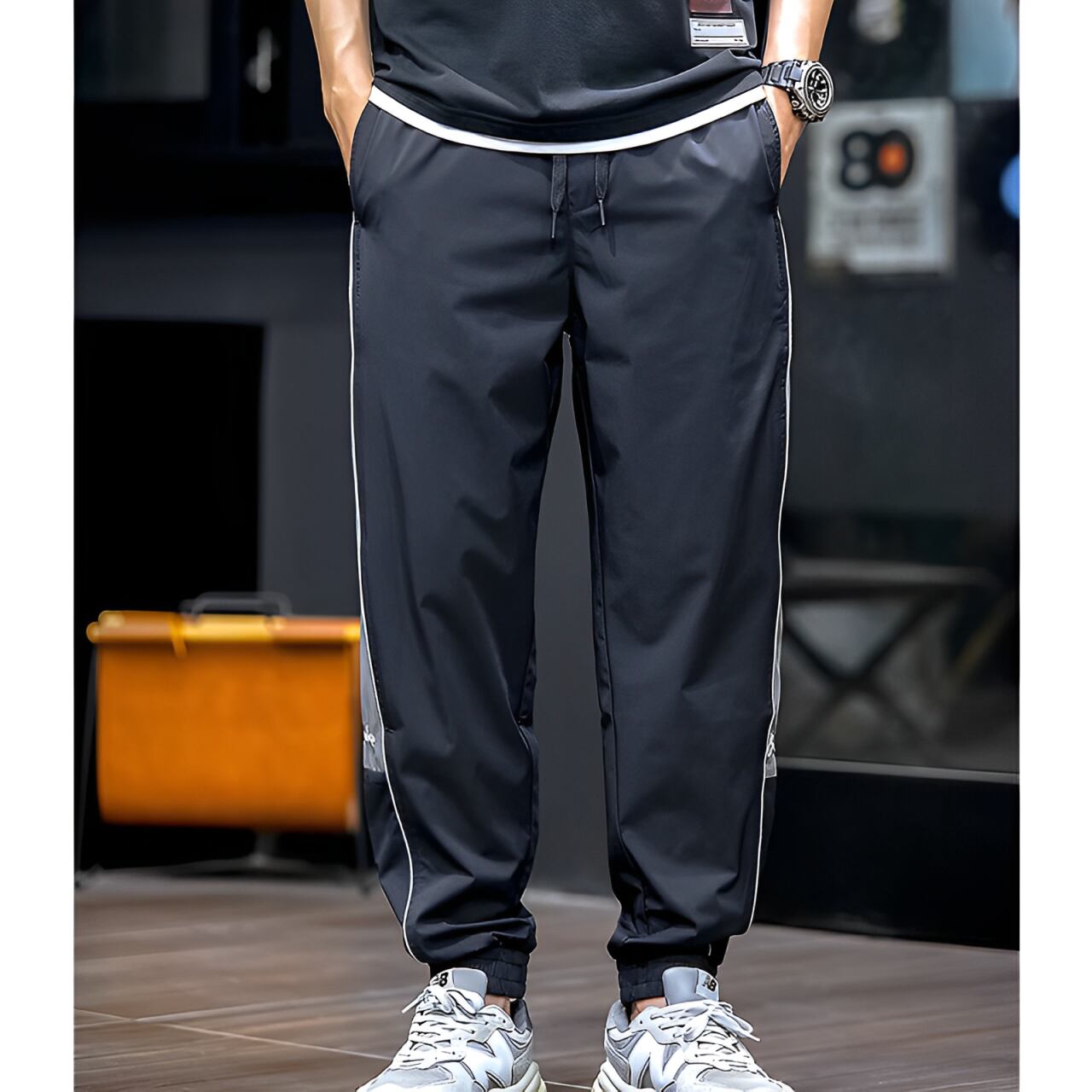すっきりとしたテーパードシルエットとリブ編みの裾が特徴のジョガーパンツです。サイドラインがデザインアクセントとなり、スタイリッシュな着こなしを実現します。普段使いはもちろん、スポーツシーンにも活躍します。