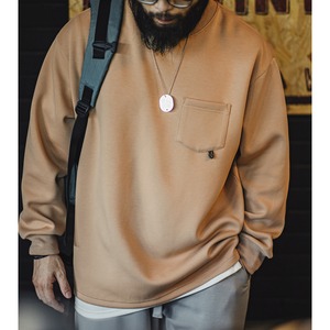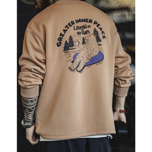 ゆったりとしたシルエットのクルーネックロングスリーブスウェットシャツです。バックプリントには、自然の中でゆったりと過ごす熊のイラストと「GREATER INNER PEACE Laugh in the Sun」のメッセージがデザインされています。リラックスした雰囲気で着こなせる、デイリーユースに最適な一枚です。
