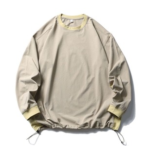 ロングスリーブのプルオーバーは、ドローコードでシルエットの変化を楽しめる1着です。シンプルなデザインながら、さりげないカラーブロックがアクセントになり、着こなしの幅が広がります。カジュアルなスタイルから、きれいめなスタイルまで幅広く合わせやすく、デイリーユースに最適です。