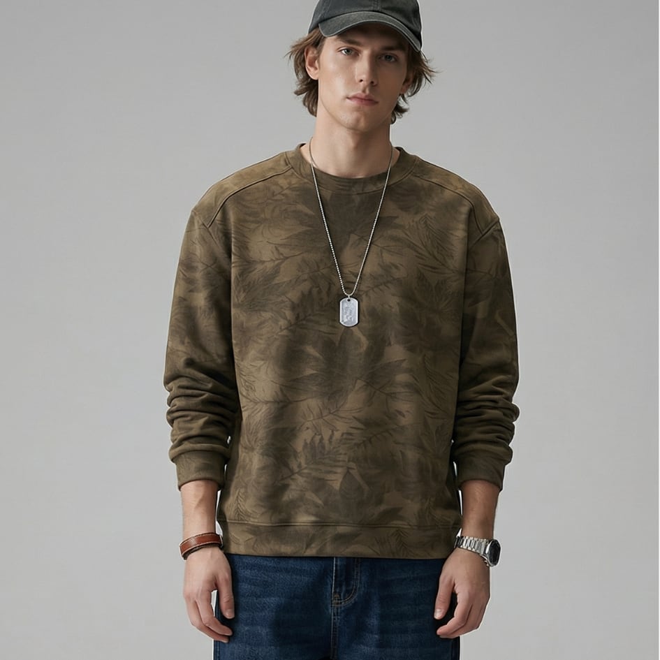 落ち着いたリーフ柄が魅力のクルーネックロングスリーブスウェットシャツです。一枚で着ても様になり、様々なスタイルに合わせやすいアイテムです。カジュアルなデイリーユースから、ちょっとしたお出かけにも最適です。
