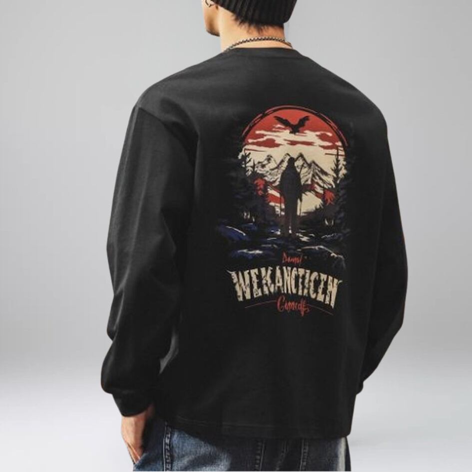 バックプリントが目を惹くロングスリーブTシャツです。雄大な自然を背景に、山を歩く人のデザインは、アウトドア好きにはたまらない一枚。普段使いにも、ちょっとしたお出かけにも着回しやすく、着心地も快適です。