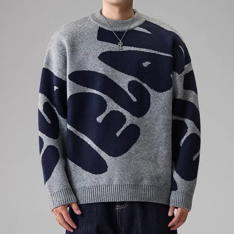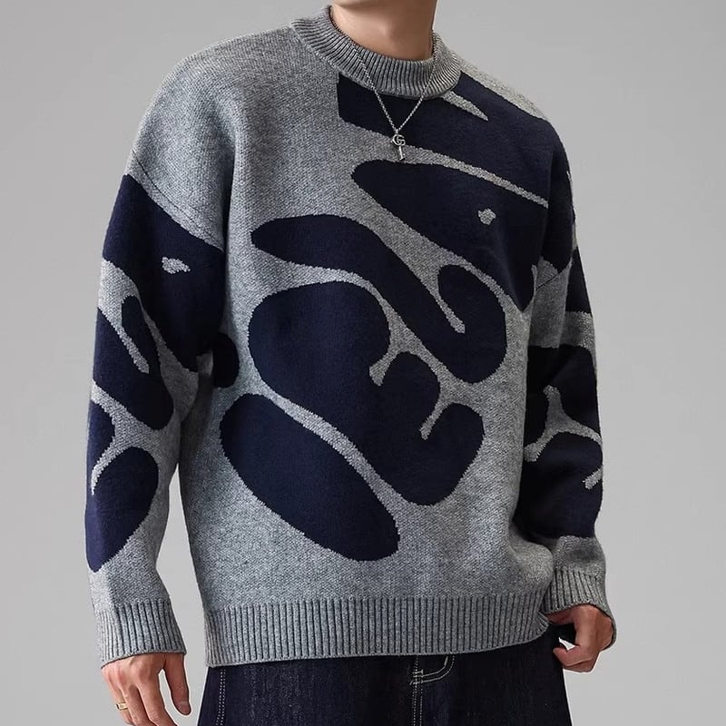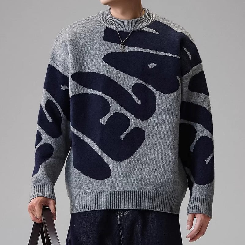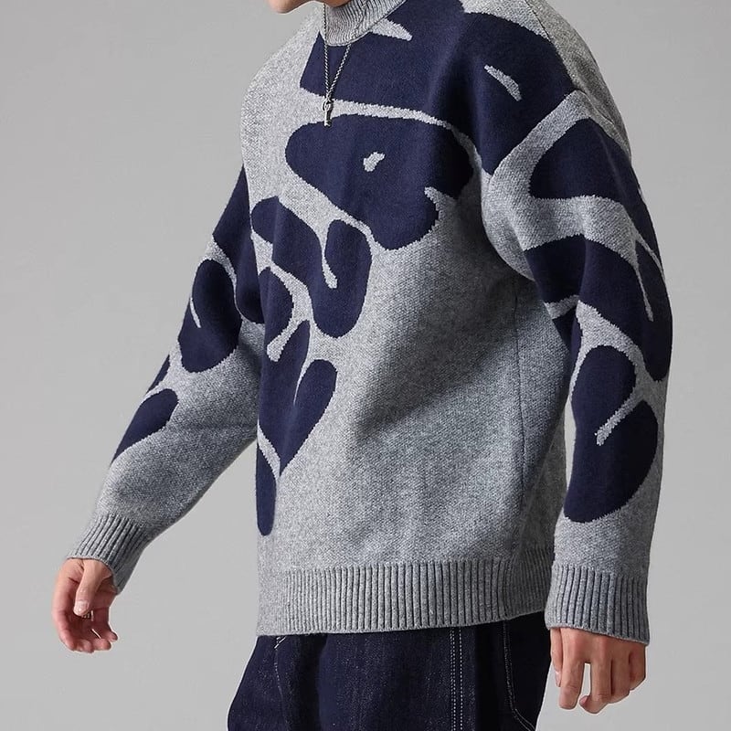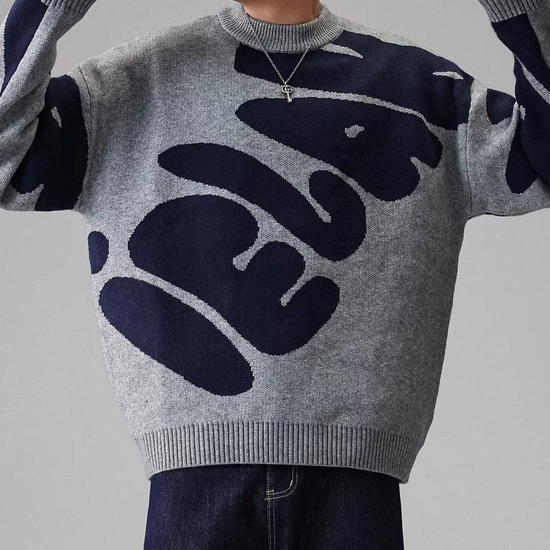 大胆なパターンが目を引くクルーネックニット。