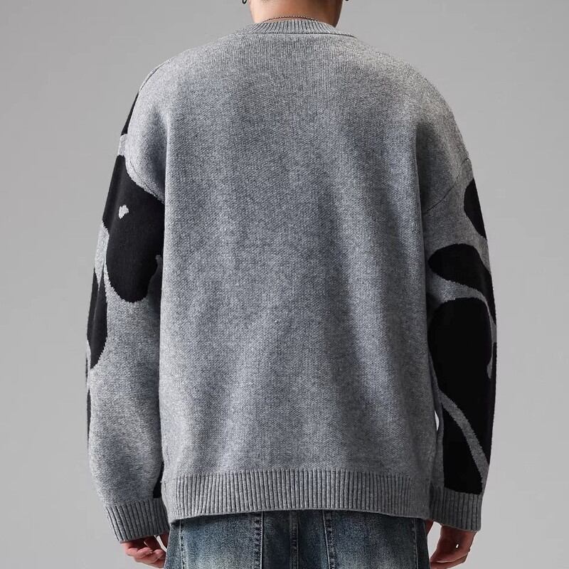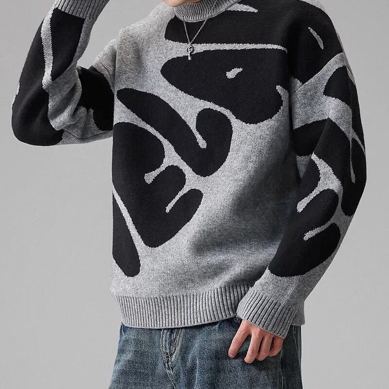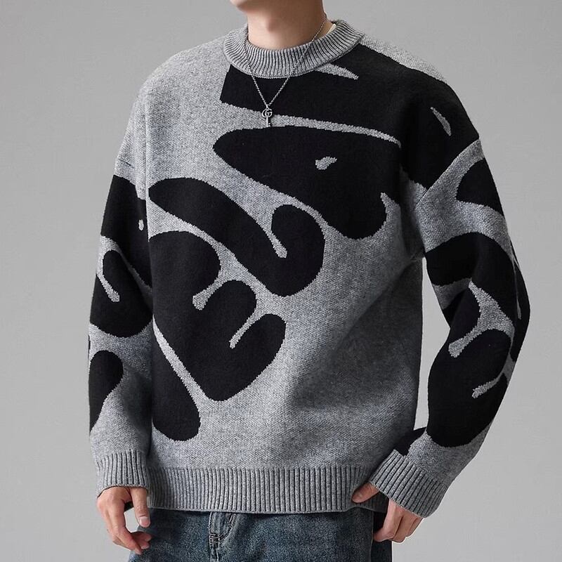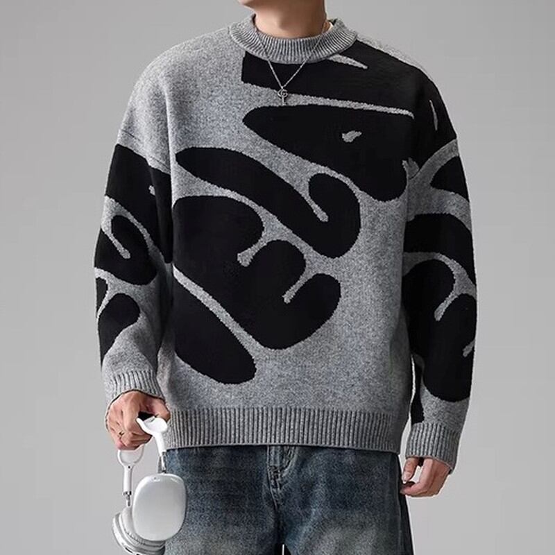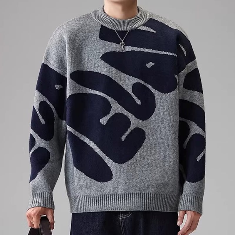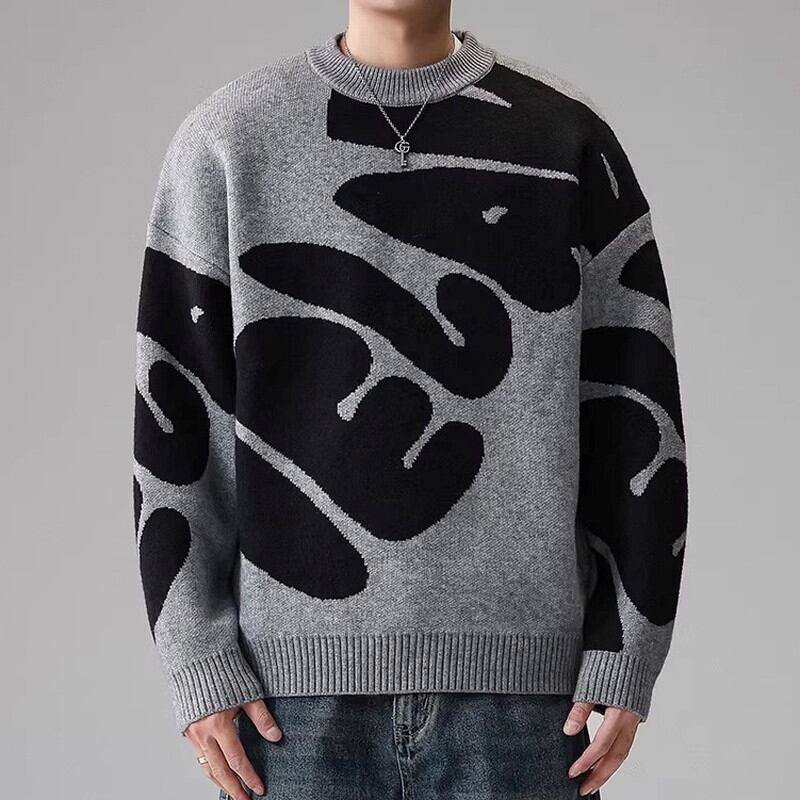 大胆なパターンが目を引くクルーネックニット。