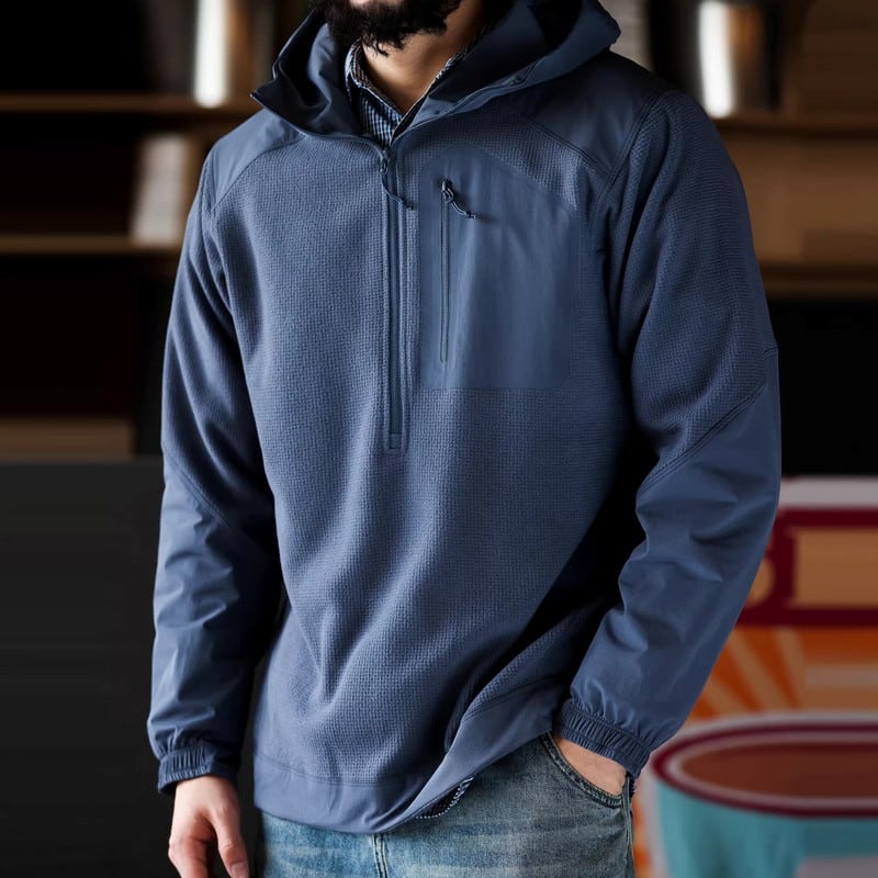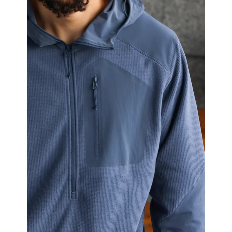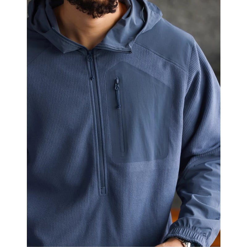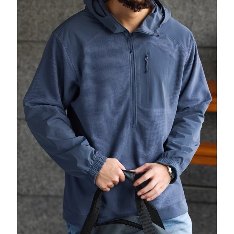 ハーフジップデザインが特徴的なロングスリーブフーディープルオーバー。