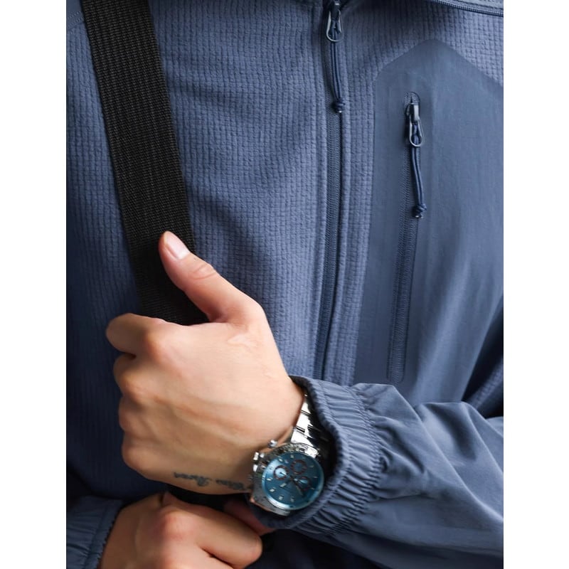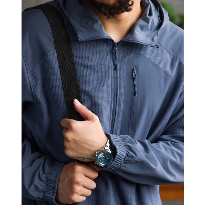 カジュアルながらも洗練された印象を与え、普段使いはもちろん、アウトドアシーンにも最適です。フロントのジップポケットは小物の収納に便利です。