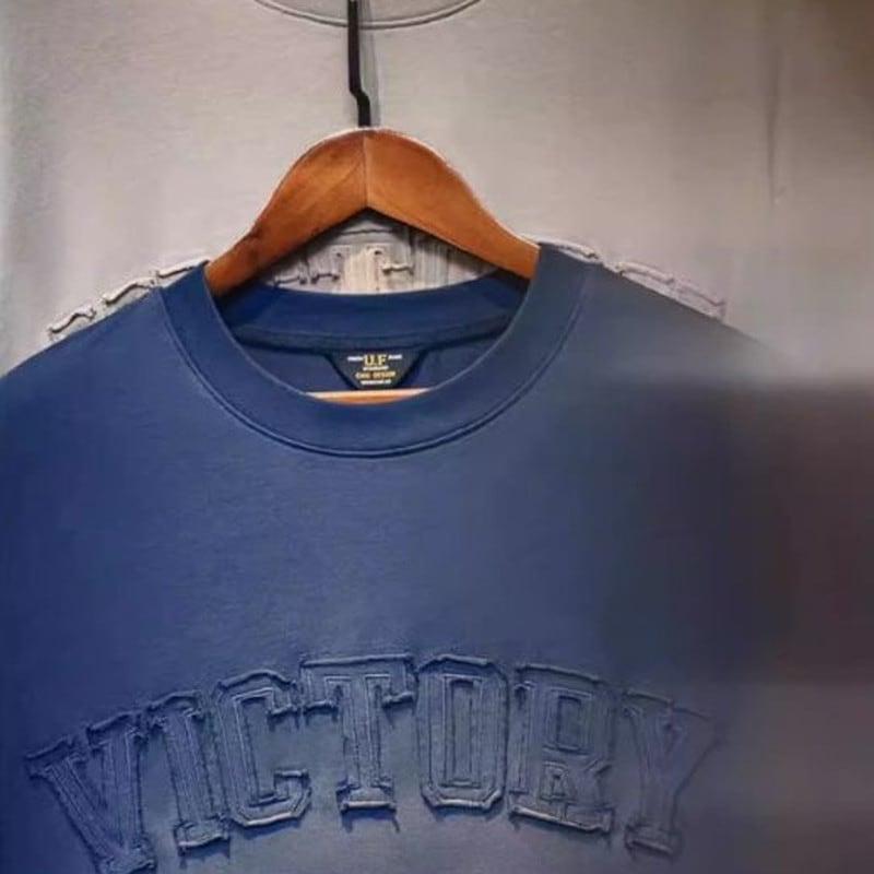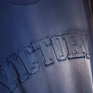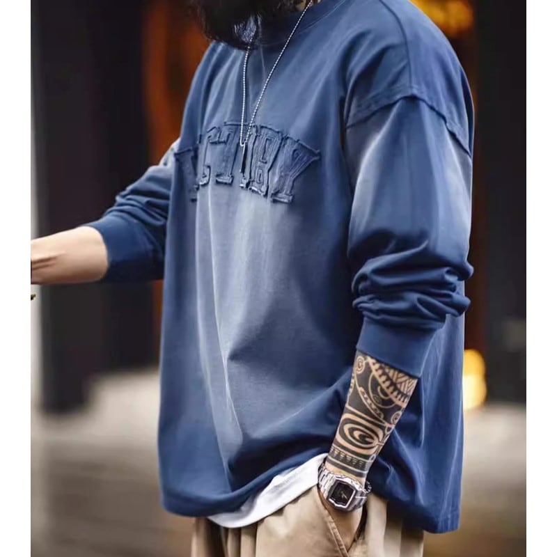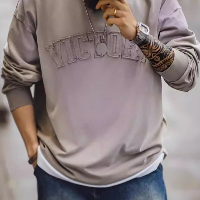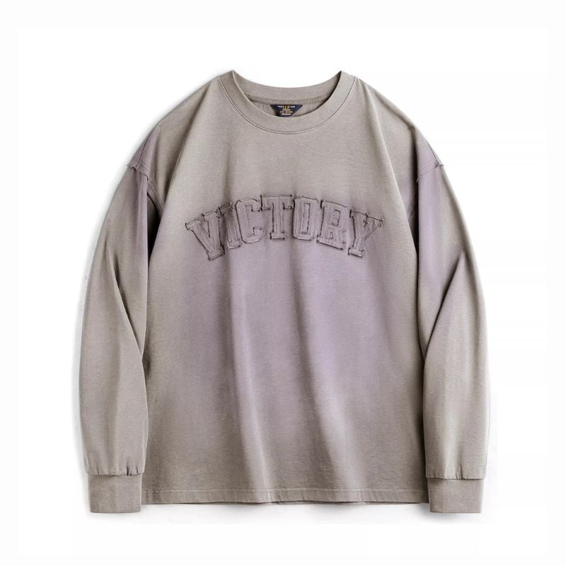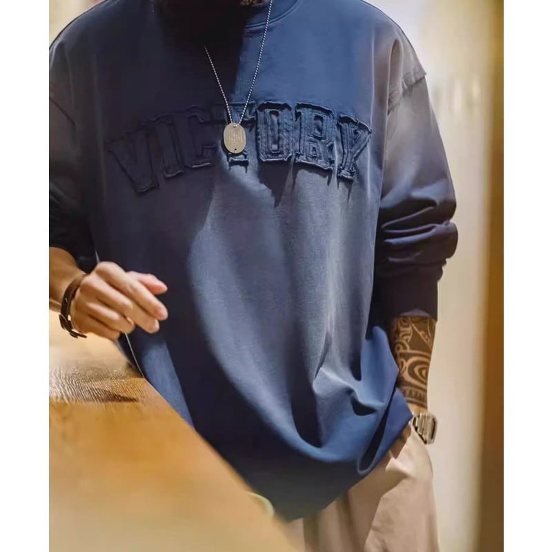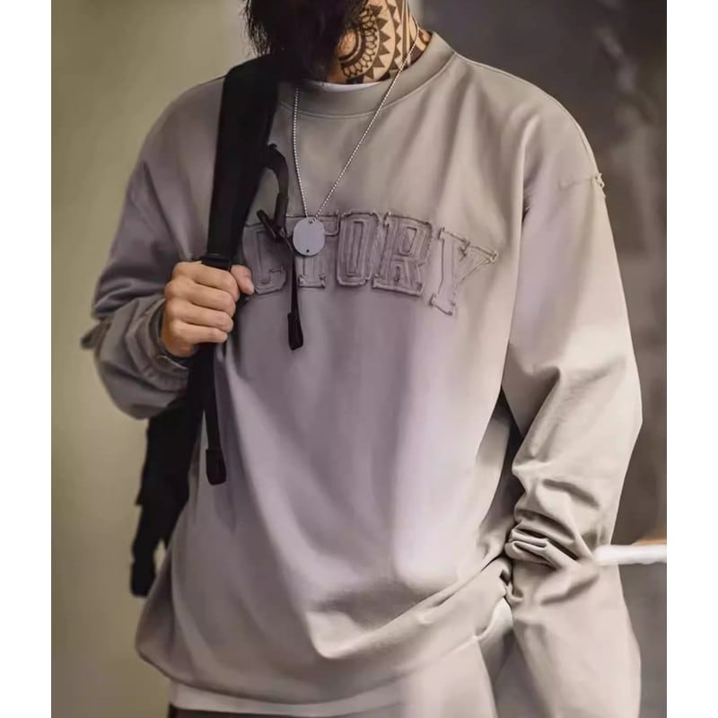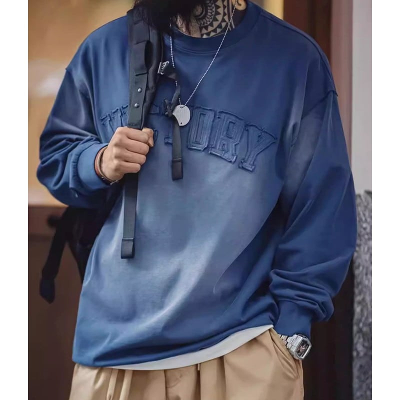 エンボス加工のロゴが特徴的な長袖クルーネックスウェットシャツ。