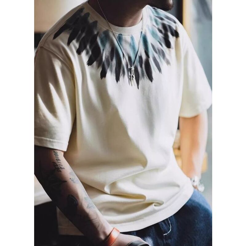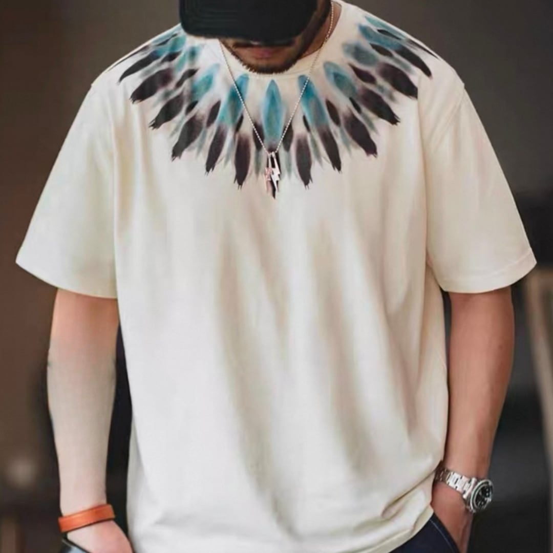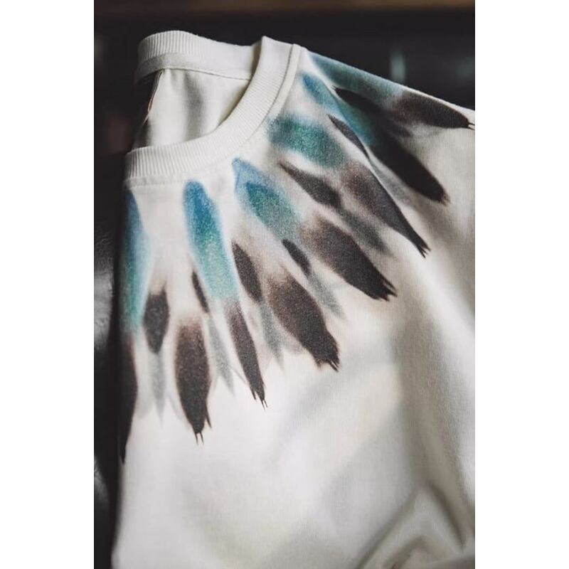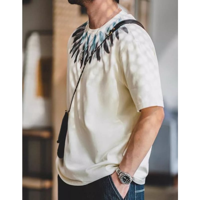 フロントデザインが目を惹く半袖クルーネックTシャツです。グラデーション染めによる独特の柄が、シンプルなデザインながらも存在感を放ちます。普段使いはもちろん、休日のカジュアルなコーディネートにもぴったりです。一枚で着でも、ジャケットやシャツを羽織ってもオシャレな着こなしに。