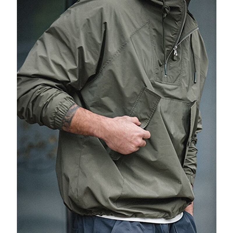 ハーフジップアップのアノラックパーカーは、ゆったりとしたドロップショルダーデザインが特徴です。ドローコードとボタンでシルエットに変化をつけられるので、様々なスタイルに合わせられます。複数のポケットが付いているので機能性も高く、タウンユースからアウトドアまで幅広く活躍します。