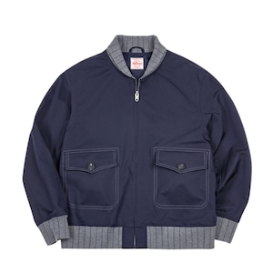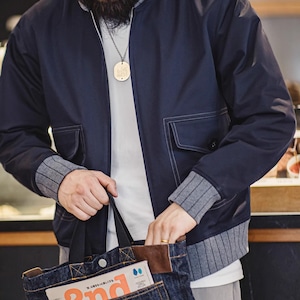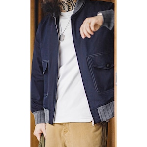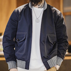 スタンドカラーのジッパーフライが特徴的なボマージャケットです。リブニットの襟がアクセントになり、落ち着いた雰囲気を演出します。すっきりとしたシルエットながらも、実用的なポケット付きで機能性も兼ね備えています。様々なスタイルに合わせやすく、秋冬のコーディネートに活躍します。