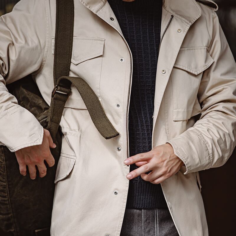 ジャケットスタイルのロングスリーブジャケットは、フロントボタンとフラップポケットが特徴です。シンプルなデザインながら、ウエストのドローコードでシルエットの変化を楽しめます。様々なスタイルに合わせやすく、デイリーユースにぴったりです。